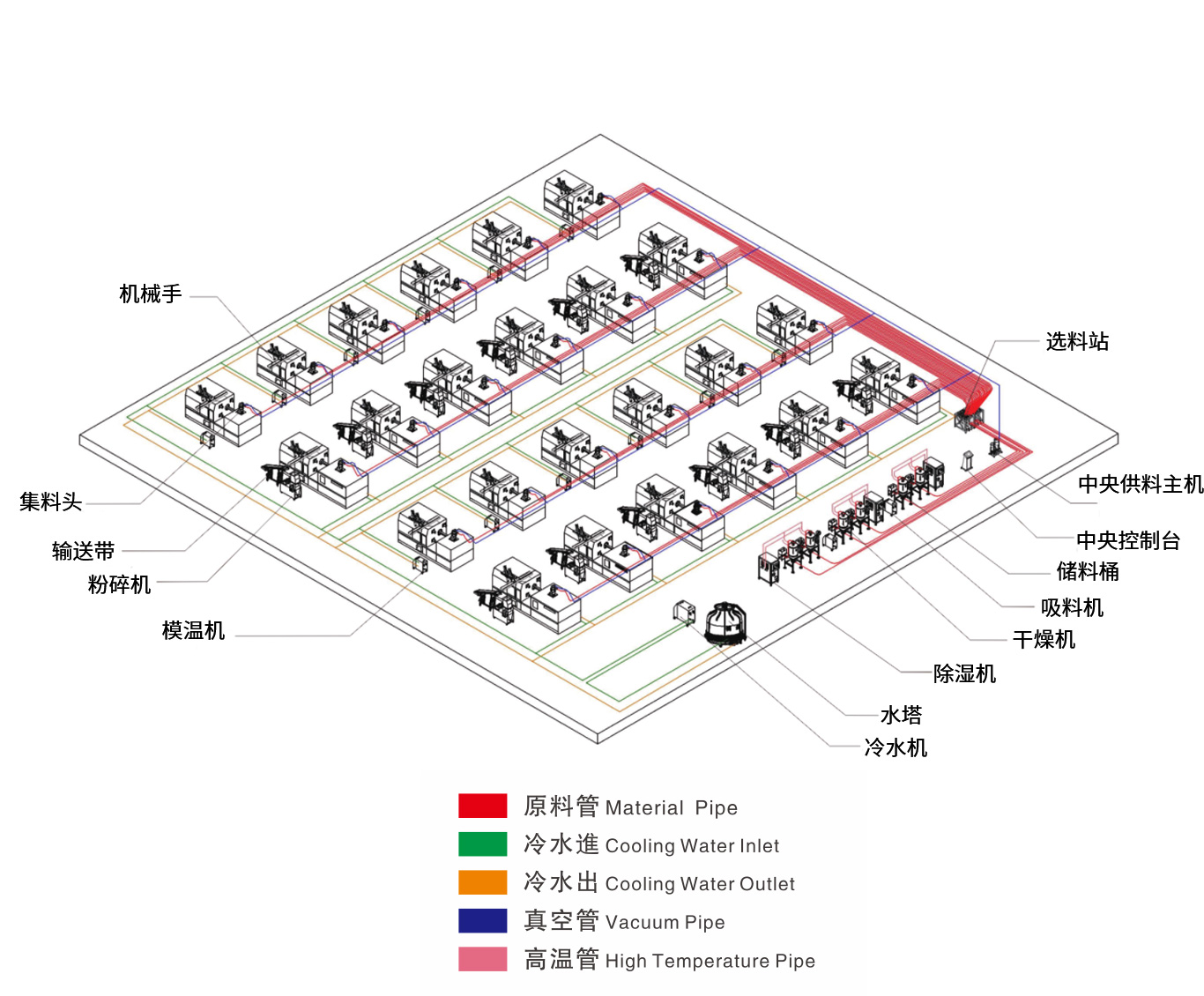 智能工厂规划中央供料九游(中国)一站式服务官网流程:原料储料--计量--干燥--输送--使用。中央供料九游(中国)一站式服务官网采用工业电脑自动对所有机台进行集中控制,实现了所有用料单元24小时连续不间断供料作业,配合九游(中国)一站式服务官网内各机台的不同功能,可以完美实现原料的除湿、干燥、输送、计量、...