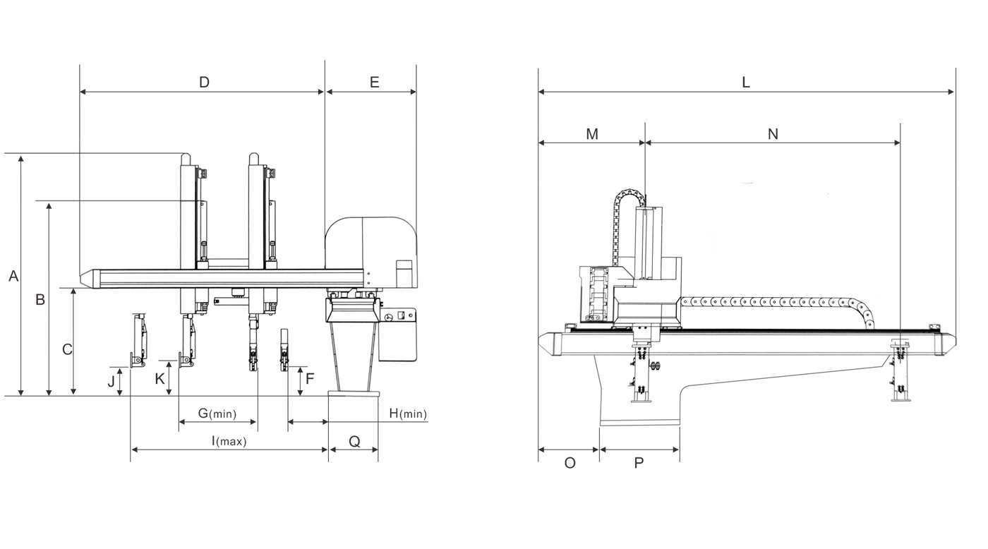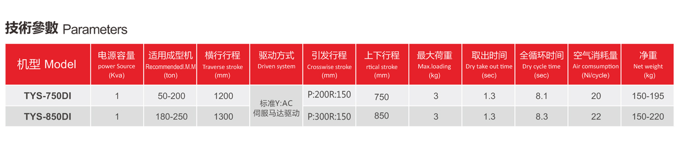 TYS系列標配為單邊式1、伺服驅動優點:調試方便,運行速度快、動作平穩,使用壽命長。2、雙截式優點:減低機械手的整機高度,動作穩定性好,手臂上下速度快。3、引拔(單邊式/框架式